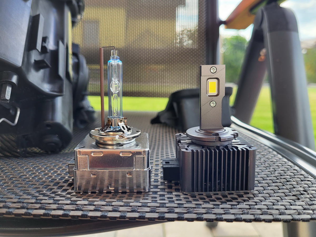 Z SK jsem objednal D1S LED 6000K žárovky od NHK a pokusil se je retrofitovat do stávajících světel s D2S úpravou plastového držáku žárovky. To se podařilo, aspoň jsem si to myslel, jedno světlo ale už nesvítilo. Z kablíků k žárovce opadávala izolace, prostě 18 let je dlouhá doba. Navíc skla už zdaleka nebyla čirá a průzračná. Vyřešil jsem to koupí nových světlometů, opět z Německa se mi podařilo sehnat prvovýrobu Magneti Marelli a za dobrou cenu. Výměna světlometů byla jednoduchá a osazení D1S LED žárovkami otázka chvílky, a svítí naprosto skvěle. Předtím zamlžení skla rozptylovalo světlo a čára byla nevýrazná, po výměně naprostá nádherná ostrá čára potkávacích světel, svítí skvěle, bíle, vše jak u full LED moderních světlometů.