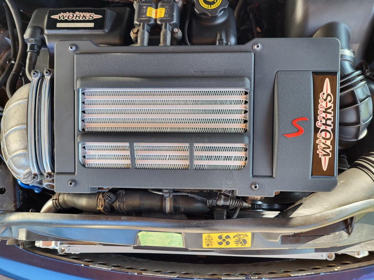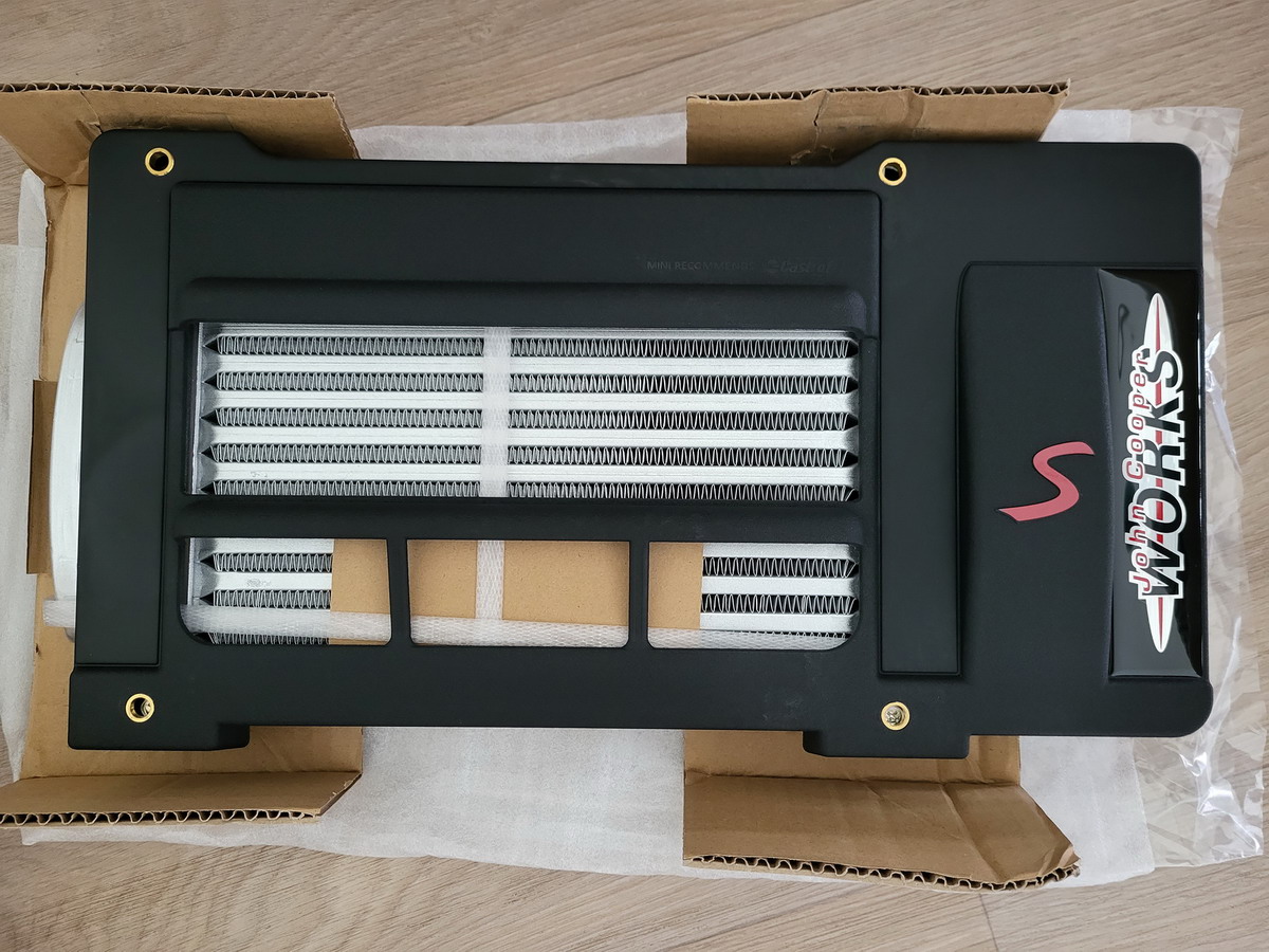 K tomu všechny nové chladiče - Mishimoto pro motor, kondenzátor klimatizace a chladič kompresoru druhovýroba Nissens (zatím oem vzhled, líbí se mi ten JCW kryt).