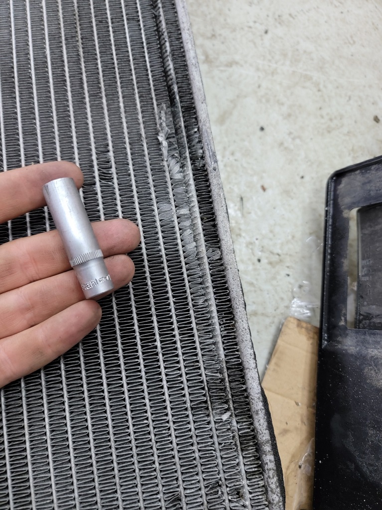 Zrezal som tiez uchyt intercoolera o cca 5mm aby som vytvoril vacsi gap medzi kapotou a IC a nabeh vzduchu bol priemejsi na rebra IC. Ako ale vidim, budem to musiet este viac zrezat.