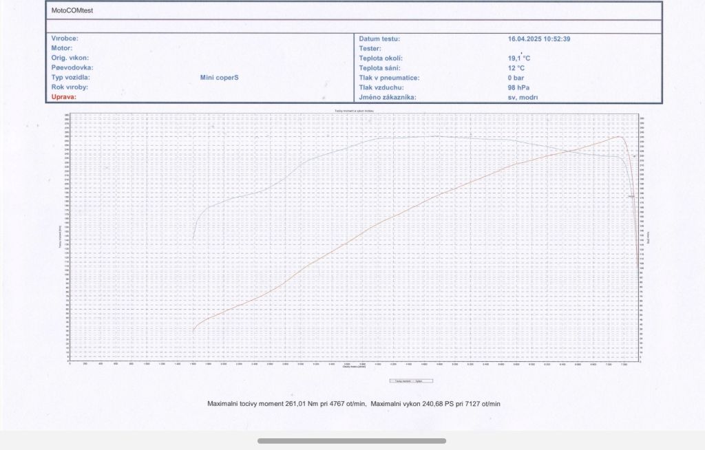 Naladěno na 217 hp (oem JCW 211 hp). Čekal jsem víc, ale v podstatě jediné, co mi tam zvyšuje výkon, je 17% řemenice, která ale víc hřeje, a tak ani GP intercooler nad 6000 otáčkami nestíhá, s Airtecem by tam bylo cca 10 hp víc (GP IC se zase mnohem rychleji ochladí). Výkon ve špičce by s 15% řemenicí byl podobný, ale krouťák v průběhu otáček nižší a mě jde víc o živost v celém průběhu než o maximální výkon ve špičce