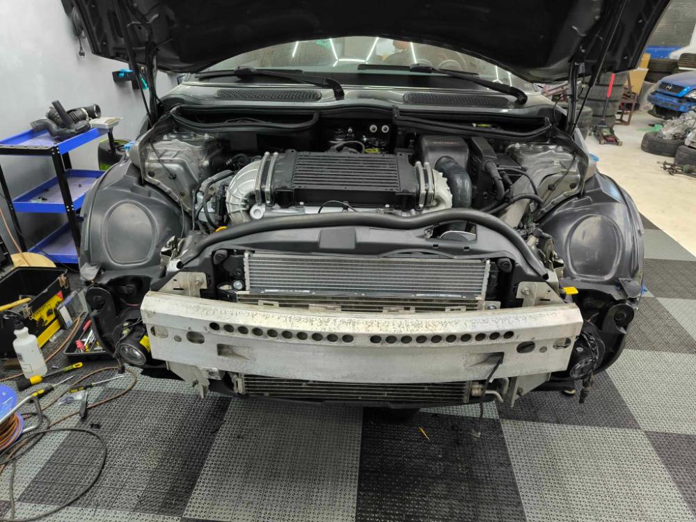 Osazen termostat s novým hliníkovým tělem, zbytek silikonových hadic, klimakompresor a řemen. Zároveň dorazila nová vylepšená Bypass klapka od Rooster Racing.