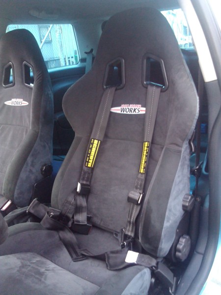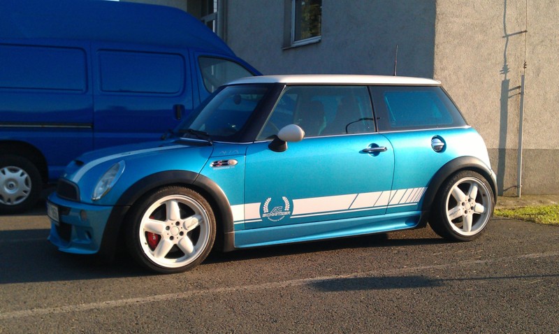 Něco málo o autě.. jedná se o R53 barvy "Electric Blue" v kombinaci s bílou střechou a zrcátky, z půlky roku 2003, koupený v ČR s najetými poctivými 141tis.km a servisní knížkou (podařilo se sehnat relativně dost informací o km a servisní historii v Renocaru Brno). Dokonce jsem dopátral, že původní majitel tady na fóru byl registrován, jenže na udaném mailu ani přes SZ už bohužel nekomunikuje. Mini je vybavený díly od německé ladičské firmy AC Schnitzer. Mezi ony díly patří výfuková soustava (na můj vkus možná až moc hlasitá), kola 7,5"x17" ET48 s rozměrem pneu 205/40 R17 zapsané v TP a rozpěrná tyč karoserie v motorovém prostoru téže firmy. Zvenčí má auto kompletní Works/Aero paket a kapotu lakovanou bílo-černými pruhy. Brzdy přední od firmy AP Racing s kotouči o průměru 304mm. Zadní brzdy jsou standard. Podvozek je sportovní, kompletně snížený (na tlumičích i pružinách) nastavitelný od firmy KW. Na všech kolech jsou 15mm podložky od firmy Eibach s dlouhými šrouby, (kvůli instalace velkých brzd. Originál AC Schnitzer disky mají totiž stejné ET jako OEM kola, takže by nešly nasadit a vadily by třmeny). V interiéru zaujmou především alcantara vyhřívané a polohovatelné Works sedačky (varianta Sparco), čtyřbodový pás Schroth u řidiče, tříramenný volant v kombinaci Works kůže/alcantara/carbon a alcantara/carbon Works řadící páka s madlem ruční brzdy. O audio se stará soustava Harman-Kardon.