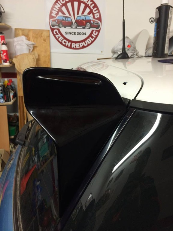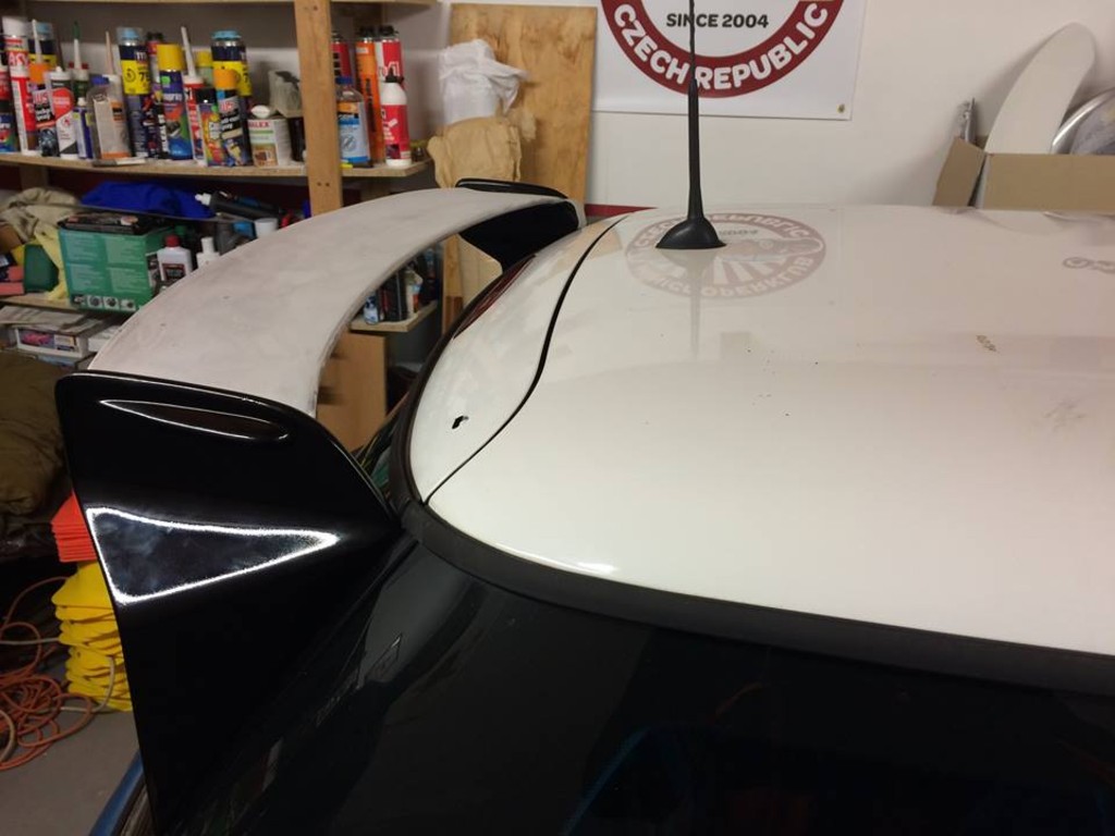 K samotné montáži.. Pokud nemáte originál OEM GP křídlo nebo jeho profi kopii Orranje G-Wing EVO2, tak jakákoli jiná varianta je pouze polotovar, který vyžaduje značnou část zručnosti a dodělávek.. Nejinak tomu bylo i v tomto případě. Laminát není zrovna nejpřesnější materiál a tak se lakovalo, tmelilo, brousilo, vrtalo, lepilo a po vyzrání polepovalo.. výsledek ale myslím stojí za to.. u auta, které je snížené+opticky přiostřené Works paketem a připravené vrhnout se bez bázně i na okruh, mi ten zadek připadal tak nějak designově nedotažený.. teď se na něj rád koukám i zezadu