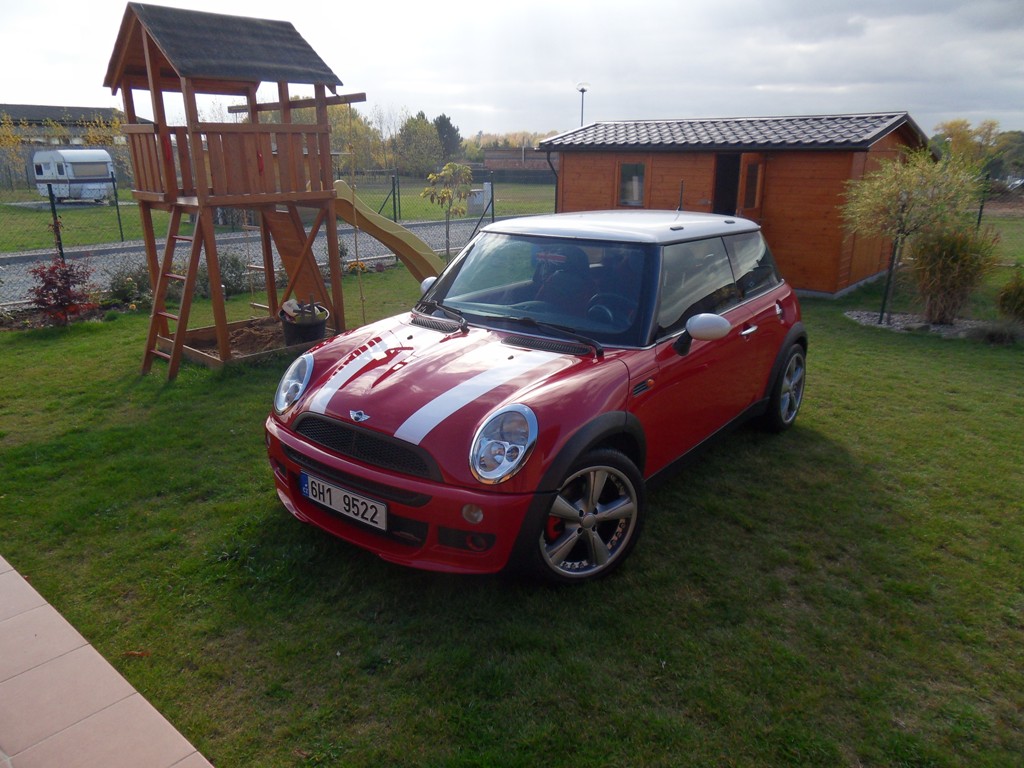 Tak chlapi, pár fotek z mobilu. Přední nárazník z toho udělal úplně jiný auto, minimálně +20hp. :lol: Kola dělají auto, pruhy dělají MINI. Ještě to bude chtít na jaře pustit krapet dolů- 20-30mm. Jcw prahy zatím ve hvězdách. S-kový křídlo to bude chtít, protože jak nám narostl zadeček, tak je potřeba to vyvážit, (takže se Žigi co nejdříve ozvu :-) a poslední velká změna - doma už čekají bílé 17 OZ ultraleggera. Teď musím jen prodat tyhle kola aby bylo na federaly :-) A pak je dloooohou dobu konec. jo, ještě, včera jsem dal KN filtr od Mekkka a doporučuju, je to paráda.