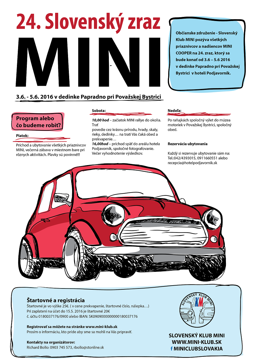 Občianske združenie – Slovenský Klub MINI pozýva všetkých priaznivcov a nadšencov MINI COOPER na 24. zraz, ktorý sa bude konať od 3.6 – 5.6 2016 v dedinke Papradno pri Považskej Bystrici v hoteli Podjavorník. Hotel sa nachádza na úpätí pohoria Javorníky v okrese Považská Bystrica, v krásnom horskom prostredí, na moravsko-slovenskom pomedzí.