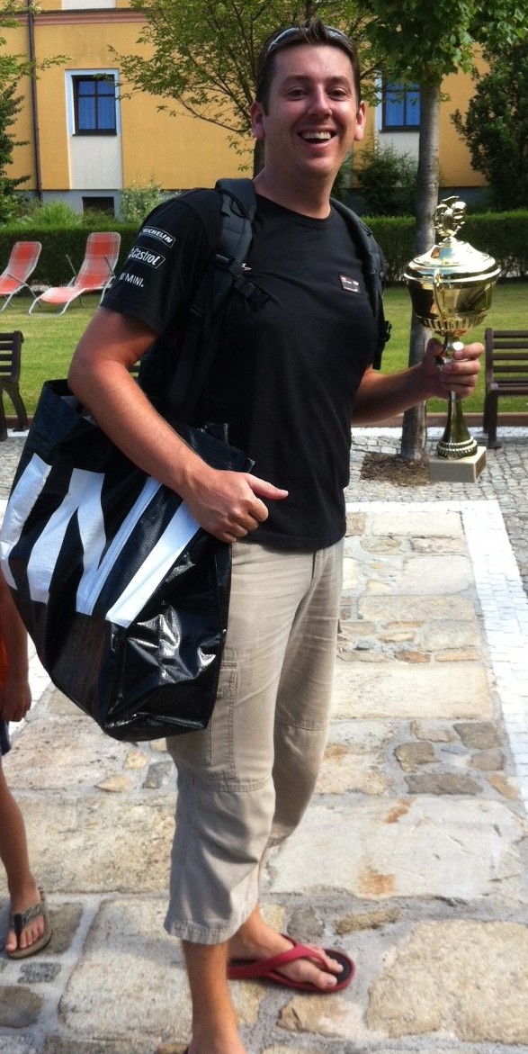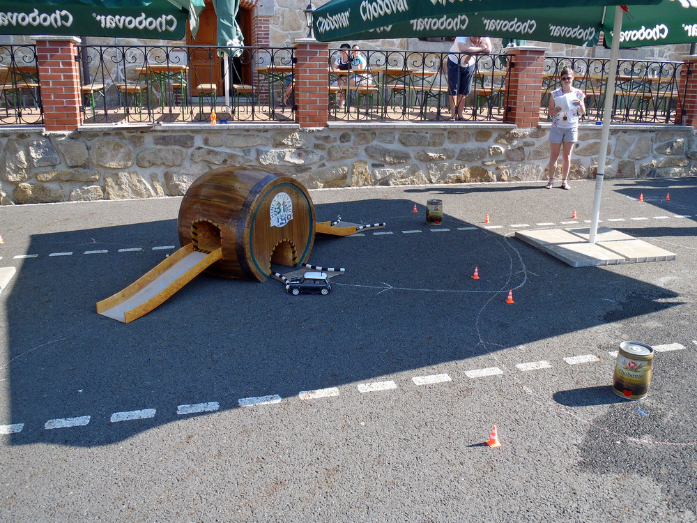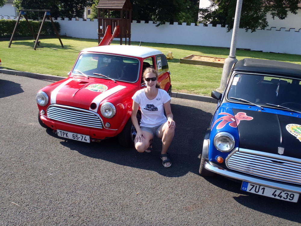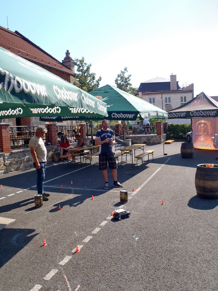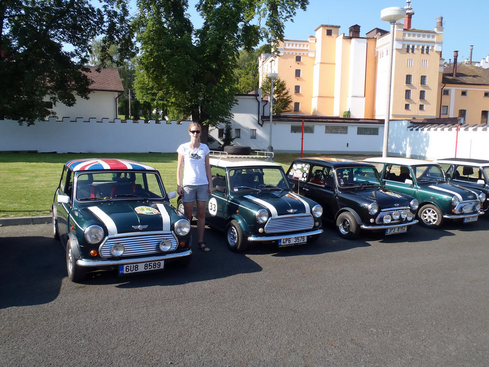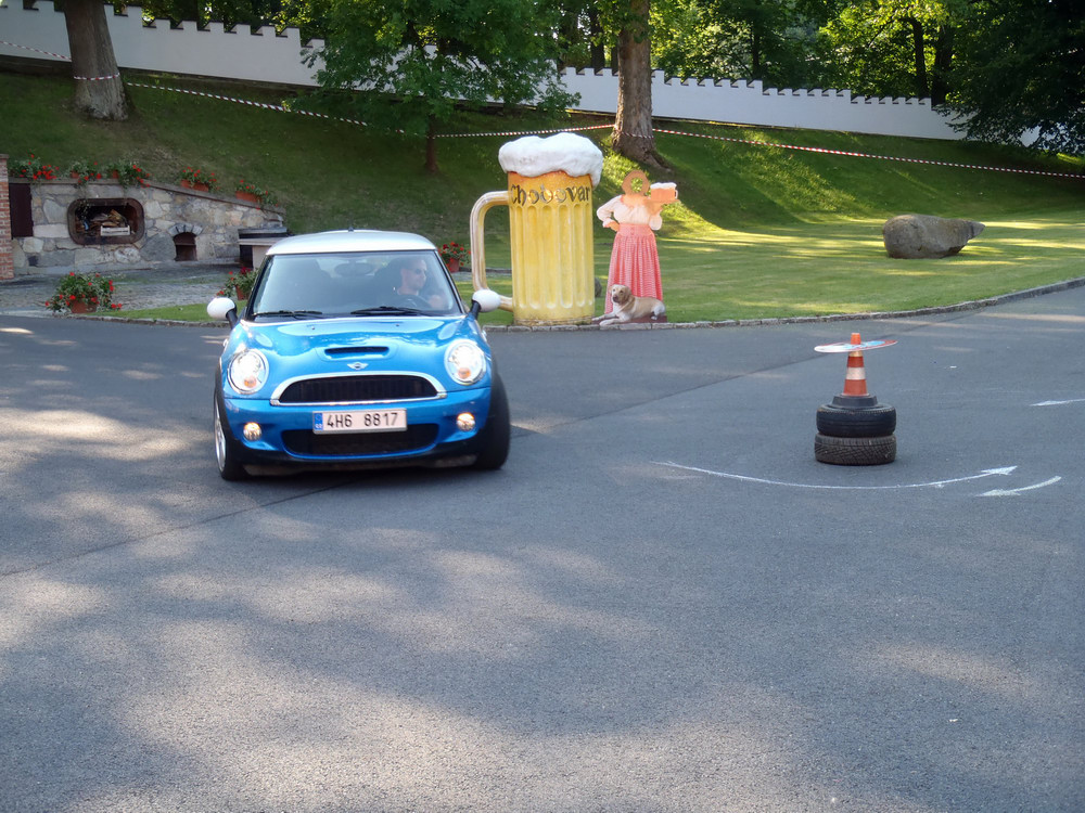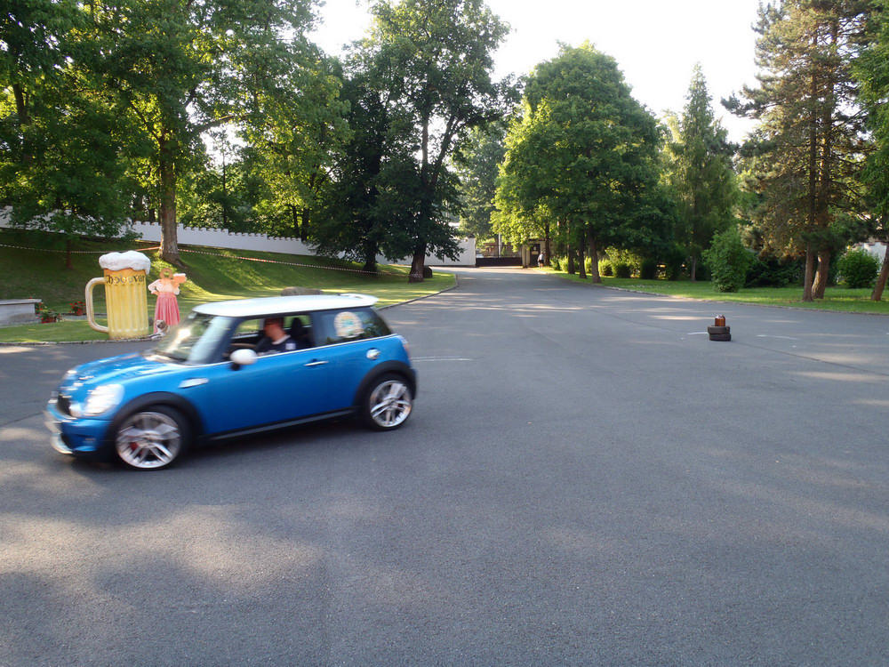 Po návratu jsme si vystáli frontu na pivo a zajištěný oběd.. jen jsme nepochopili proč se nás ten pán za grilem ptal, jestli chceme tu krkovičku propečenou nebo růžovou.. všechny totiž ve finále byly „rare“.. o to víc piva jsme si dali v pauze před odjezdem, který byl naplánován na 15h v koloně za doprovodu místních policistů a dobrovolných hasičů, aby se zajistil plynulý průjezd dlouhého hada čítajícího cca 33 Mini. Po příjezdu do pivovaru jsme se seřadili dle čísel a začali startovat do připravené slalomové dráhy, která po technické pasáži, obsahovala i 2 rovinky a zatáčku olemovanou trefně „zeď šampiónů“ protože obvzláště při nájezdu zespodu do zatáčky a při příletu zhora se ta bílá stěna nebezpečně opticky blížila.. Neúčasti Hansa a Colíka využili dokonale Radek Michna, Chochol a Minitom a rozdělili si bednu.. jen těsně ale už v závěsu za bednou, se tísnily první dvě New Mini a výsledných prvních 5 posádek se vešlo do jedné vteřiny, takže bylo na co koukat.