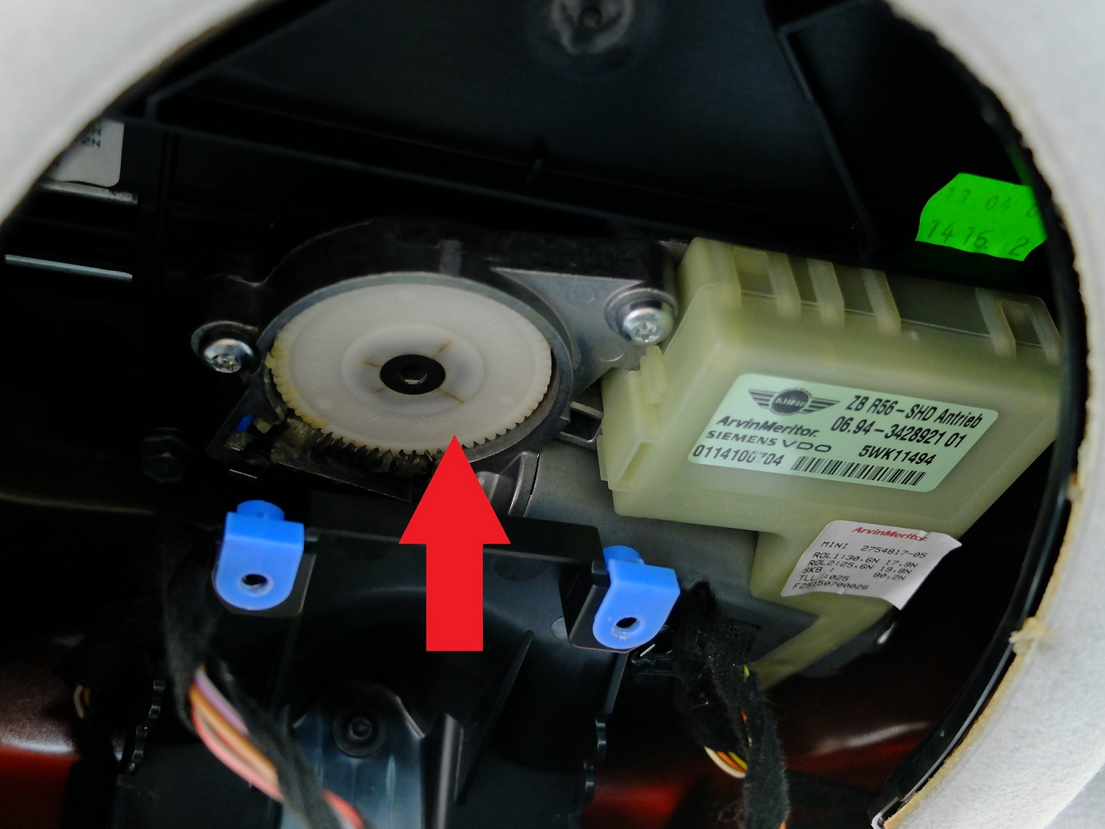 mínusy: nejde. Po 6,5 roku nejde. Ostalo nehybné ako somár v uliciach Mediny, keď ho chcete odtlačiť, lebo vám zavadzia v ceste. Pri jednom otvorení čosi zachrapčalo a už nejde. To čosi je malé plastové koliečko v motorčeku otvárania (viď obr.), ktoré preskočilo o zúbok a na jednom mieste to začne točiť naprázdno. Pokus o jeho nahradenie zatiaľ neúspešný. Je super, že tam je slabý článok, ktorý povolí a ochráni iné veci, ale prečo, soudruzi z NSR, mám kvôli kusu za 35 centov kupovať celý motorček za 300 doláčov, kua?