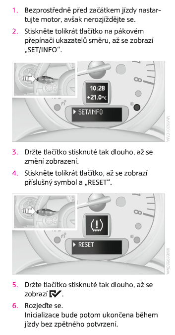 Proklikáním menu vidíš volbu SET/INFO? Podržením tlačítka vstoupíš do tohoto podmenu. A proklikáním najdeš pneumatiku s vykřičníkem a nápisem reset. Nebo to tam fakt nemáš?