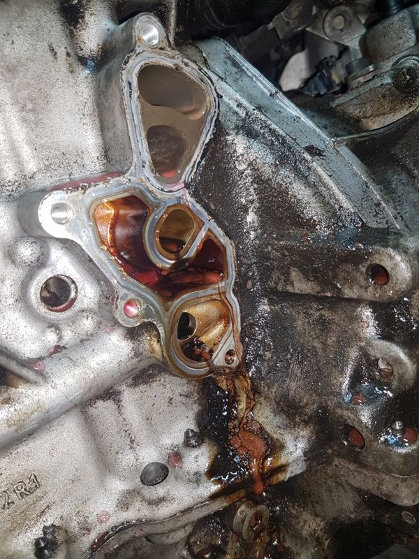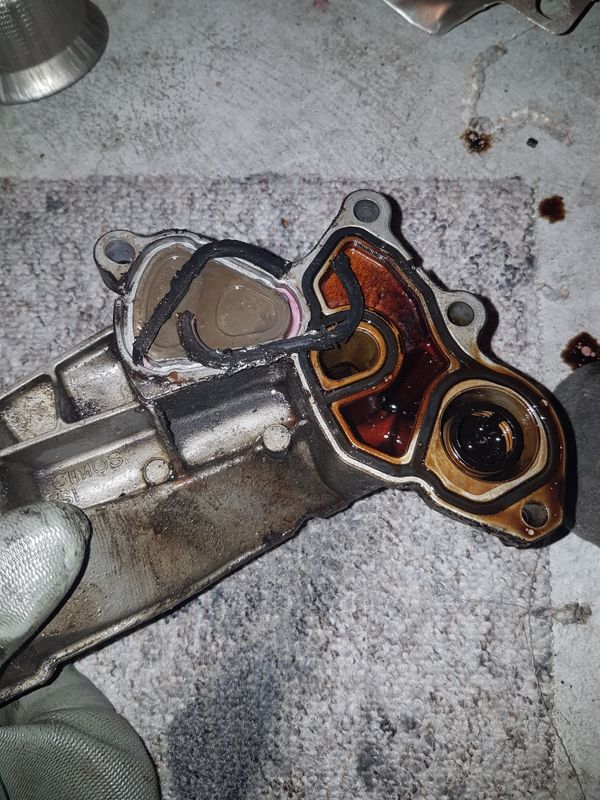 Zároveň jsem přitom vyměnil těsnění pod blokem olejového filtru. Turbo verze tam mají i chladič oleje, u mě jen záslepka. Těsnění popraskané a tvrdé, a tekl mi z toho olej po celém motoru. Jen je nutné vypustit chladicí kapalinu.