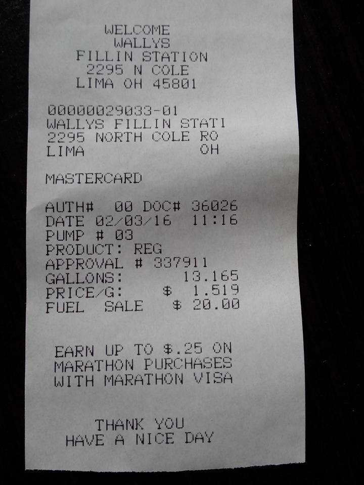 Dnešní tankování,13,165 gallons = 49,83 Litru, cena 20 dolaru = 495,-kč