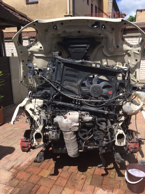 Oprava (vymena) jako takova neni az tak slozita. Bud se dela "jen" v servisni poloze chladicove steny (coz je asi husta gynekologie) - nebo ze se sunda cely predek. Ja zvolil druhou variantu, protoze jsem chtel povymenovat vsechny hadice napojene na turbinu a to v servisni poloze asi neni uplne vhodne. Takze rozborka zapocala - vsechno v pohode, az na jeden zadrhel. Jak jsem dodelaval LED denni sviceni, tak jsem si protahnul kabelaz skrz chladicovou stenu a to mi znemoznovalo oddelat si stenu na stranu. No, tak jsem to zase predelal a stena sla na bok.