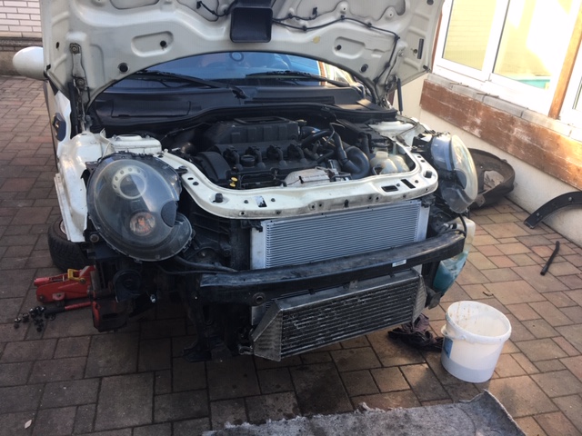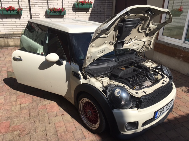 No a to bylo vsechno, zpetne osazeni s bonusem - dal jsem konecne JCW vyfukove parohy, tak jsem zvedav na zmenu v chovani motoru. Dodatecne jsem odizoloval vyfukovou cast turbiny textilii od Minimika a navrch jsem dal i vetsi intercooler, tak to asi bude uplna stihacka