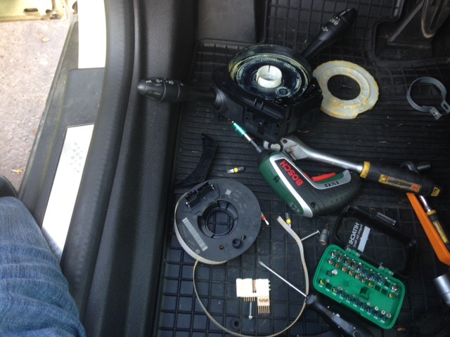 Tak je na case dat i neuspechy. Zprovozneni multifunkce na 2. Gen neni uplne prdel. U prvni stacilo vymenit packu a natahnout par dratku. U 2. Gen je vsechno jen v hardwaru. Takze musite najit spravny typ pacek (guru OKCZ opet pomohl) a uz jely packy z US. Dnes prisla na radu montaz. Bohuzel jsem zopakoval pribeh "buchty" Takze pri montazi jsem prehledl pootoceny krouzek a tragedie byla tu. Pri plnem otoceni volantu jsem utrhl ten pasek pod volantem :idea: Neni cas na zmatky, kombinace dvou sestav do jedne vse vyresila. Funguje multifunkce (krom tempomatu) sviti tlacitka ale je potreba jeste dokodovat. Nefunguje DSC, stiraji sterace pri startu atd. Ale bude to dobry :bigups: