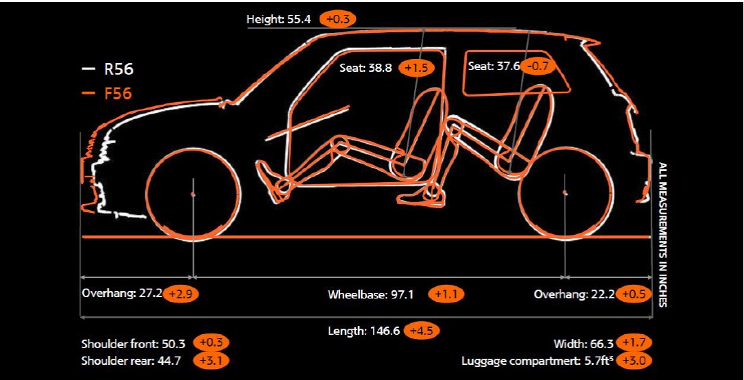 Vzhled: Mně osobně se nové MINI...líbí. Ano, spodní gril je diskutabilní a také by se mi asi líbil jinak, ale celkově se mi design líbí. Nemyslím si, že by se nějak zaprodal a nebylo to pravé MINI, naopak navazuje na prvky z dřívějška aniž by nějak ustrnulo, působi vlemi svěže. Linie střechy je nižší a auto opět o něco širší. Celo-LED světla jsou opravdovou lahůdkou.