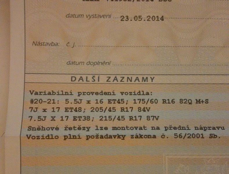 No já mám na autě dokonce ET 38, ale je to šířka 7,5" - no a teda už tam musí být šířka gumy 215. Ta kola koupil předchozí majitel v Německu a s nimi jsem si to dovezl. Naštěstí byl ke kolům certifikát TUV a šlo to zapsat do českého techničáku (na fotce 4. řádek v textu). Neškrtá to i když je auto sníženo a na okruhu to dostavá zabrat - plné brzdy do zatáčky a tak.