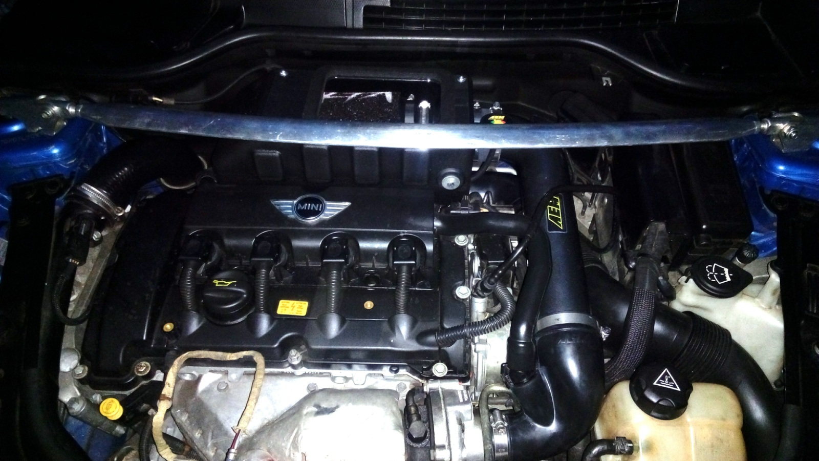 BTW. Ta JCW rozpera se tam vlezla tak tak. Mozna casem vymenim za AEM.