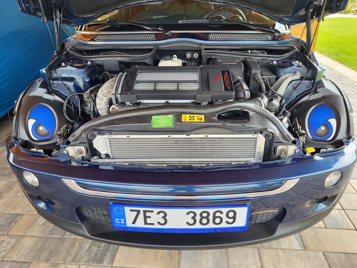 Starý intercooler kompresoru už byl dost zašlý, z Německa se mi podařilo sehnat repliku GP intercooleru od Nissens a i originální GP kryt intercooleru. Ceny mimo, ale chtěl jsem, ať to vypadá a už jsem tam tak jako tak zahučel strašně moc :biggrin: Motorový prostor jsem kompletně vyčistil, škrábance na laku opravil barvou a jako třešničku na dortu pořídil očička Minimeyes.
